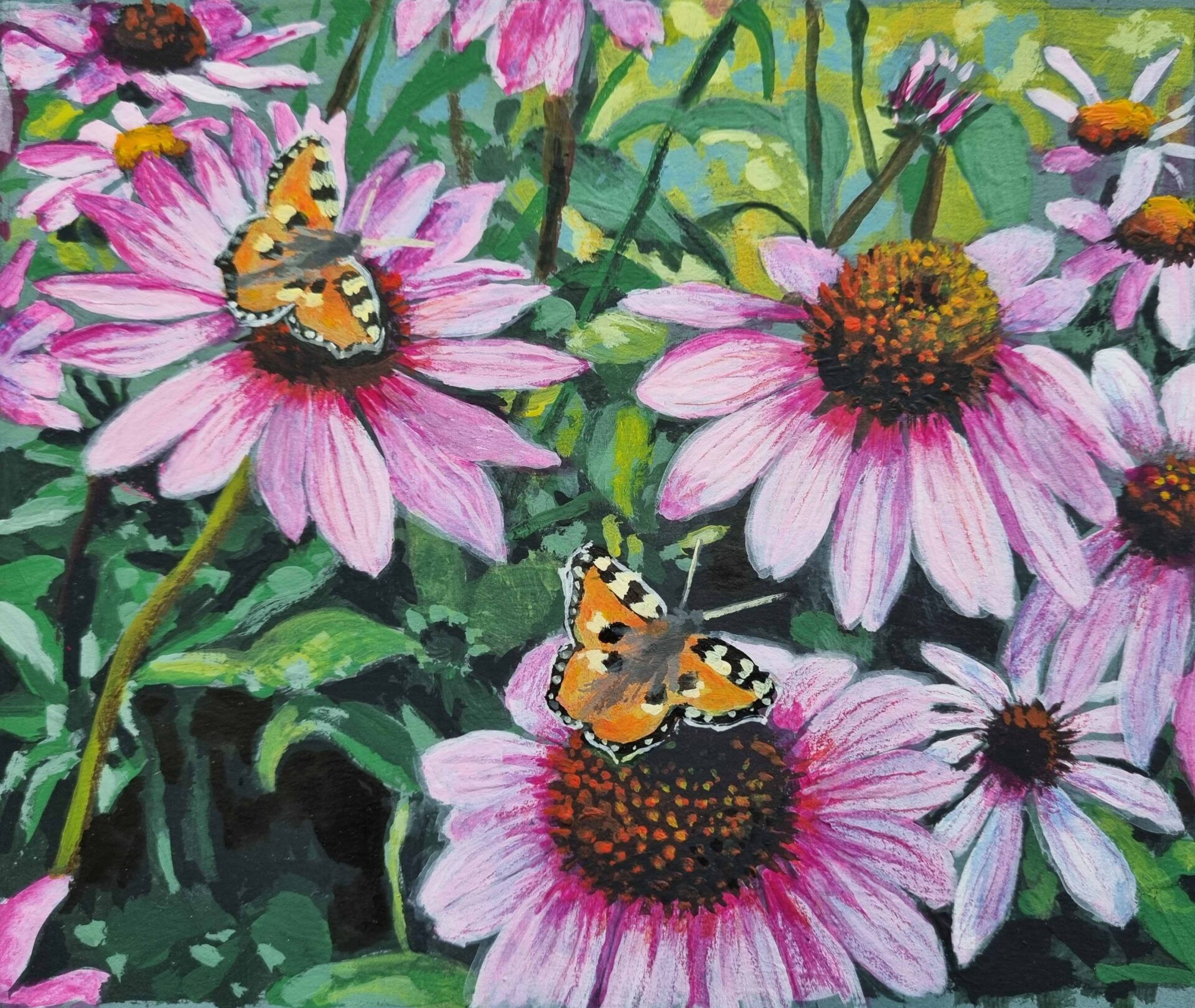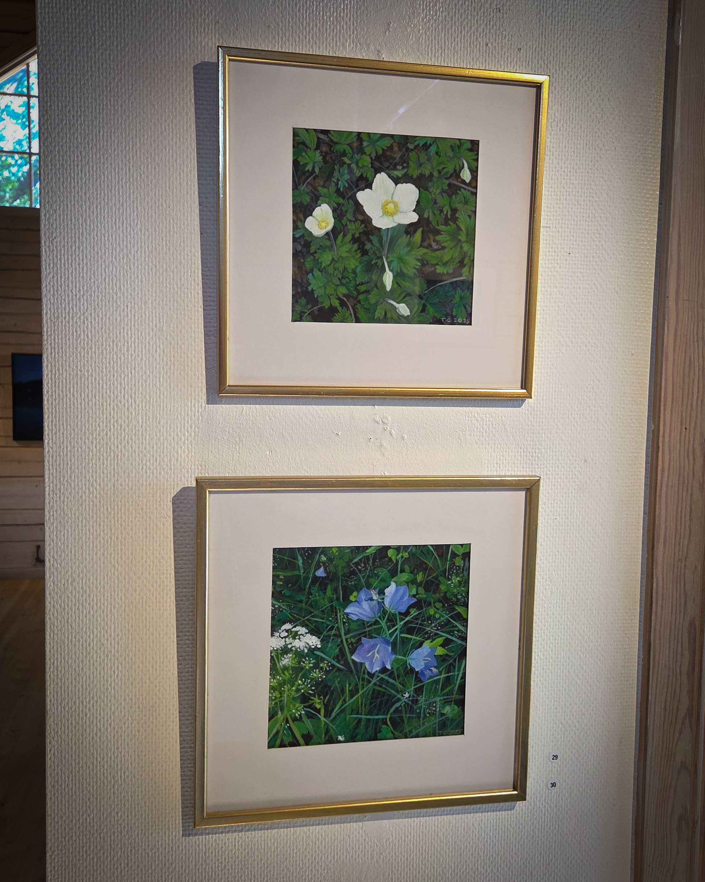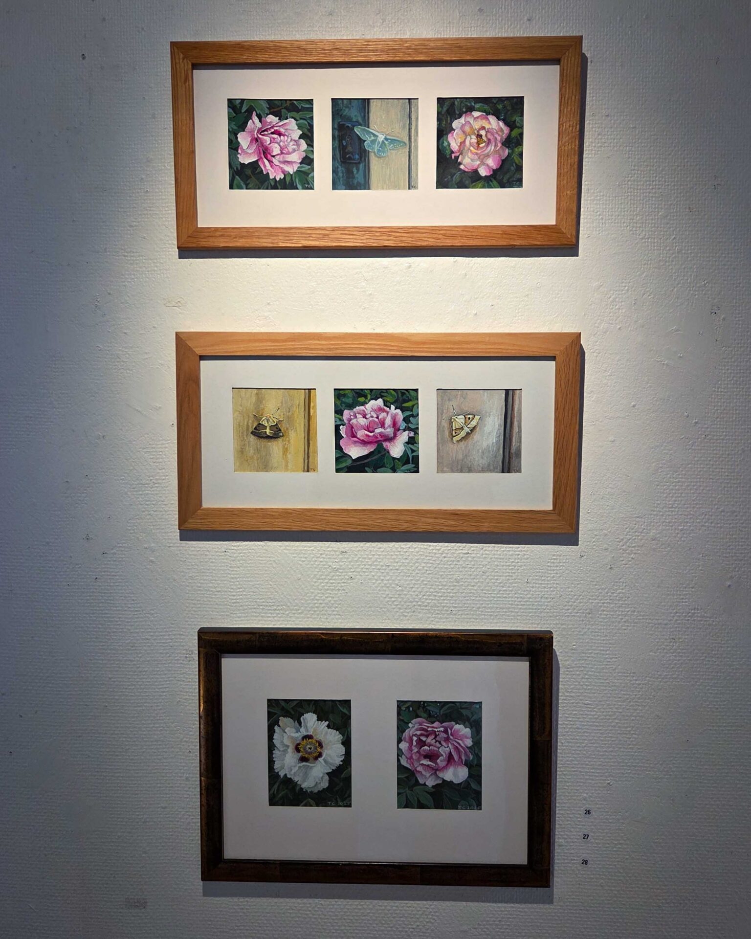 Miniatyrmålningar, 2025 Play Pause Unmute Mute Små bilder med olika motiv såsom blommor och fjärilar. Vissa bilder är inramade tillsammans i en ram. Akryltempera 2025. Foto: Tor Cederman.