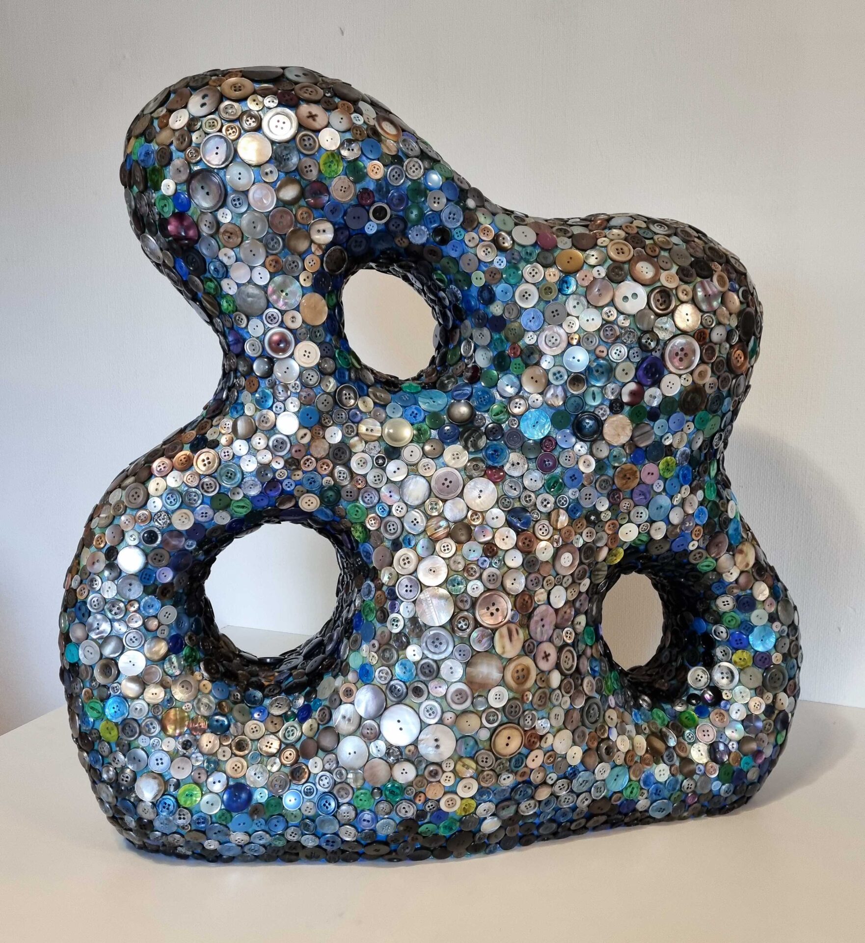 Vattenande, 2025 Play Pause Unmute Mute Skulptur ”Vattenande”, blandteknik med knappar 2025. Cirka 85 cm hög. Foto: Tor Cederman.
